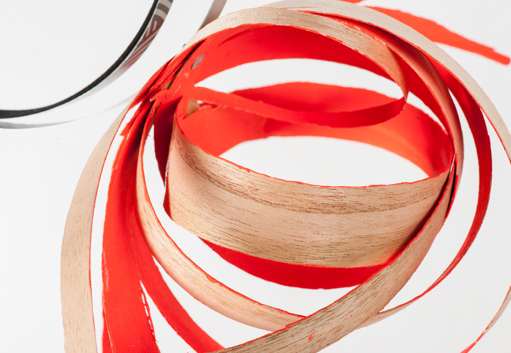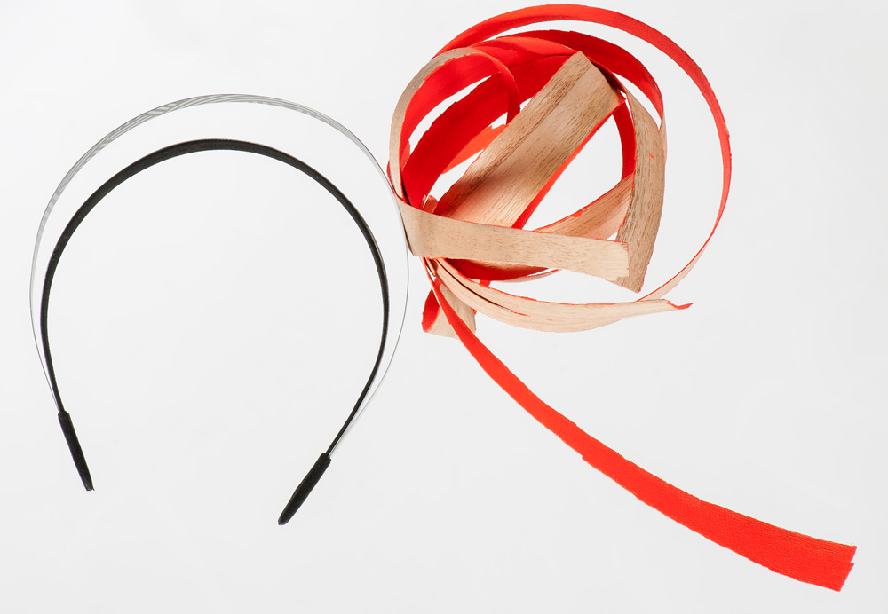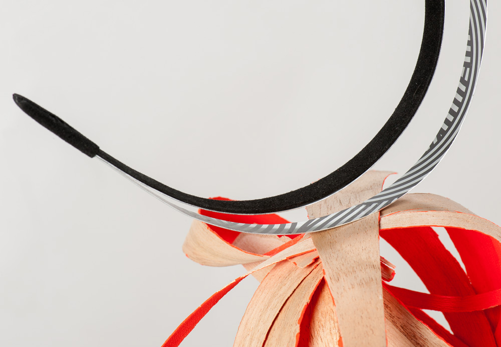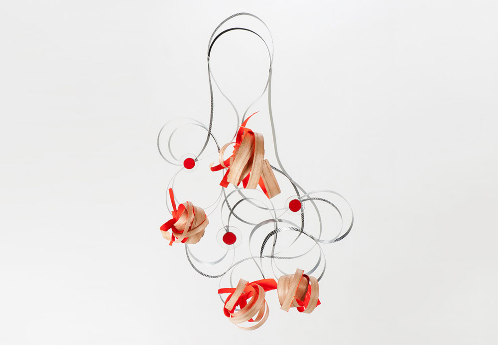 Cintas curvadas, tensionadas y unidas por nodos. Trama y color, materiales que contrastan, el collar se contornea, crece y acompaña el cuerpo de la mujer, generando movimiento, vida, elasticidad e impacto.