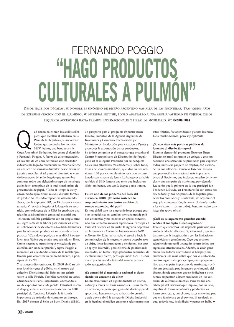 FERNANDO POGGIO “HAGO PRODUCTOS CULTURALES A PULMÓN” DESDE HACE DOS DÉCADAS, SU NOMBRE ES SINÓNIMO DE DISEÑO ARGENTINO MÁS ALLÁ DE LAS FRONTERAS. TRAS VARIOS AÑOS DE EXPERIMENTACIÓN CON EL ALUMINIO, SU MATERIAL FETICHE, LOGRÓ ADAPTARLO A UNA AMPLIA VARIEDAD DE OBJETOS: DESDE PEQUEÑOS ACCESORIOS HASTA PREMIOS INTERNACIONALES Y PIEZAS DE MOBILIARIO. Txt: Cecilia Filas Qué...